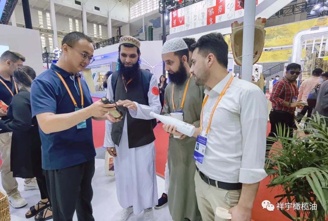 展會(huì)現(xiàn)場(chǎng),來(lái)賓、客商紛紛到祥宇橄欖油展臺(tái)前駐足品鑒,